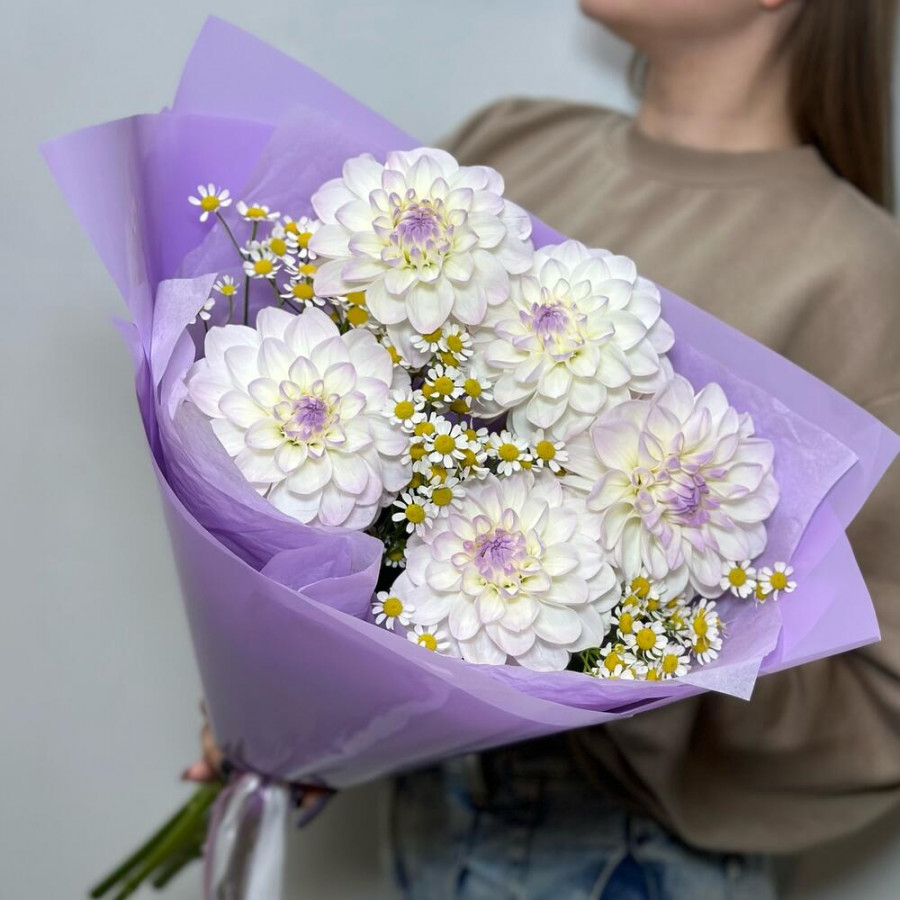 На фото букет из 5 белых георгин с ромашками. В составе: георгина 5 шт, танацетум 3 шт, дизайнерская упаковка 1 шт, атласная лента 1 шт, . Все цветы свежие и ароматные, букет красиво оформлен и отлично подходит для подарка. Доступна доставка цветов или самовывоз.