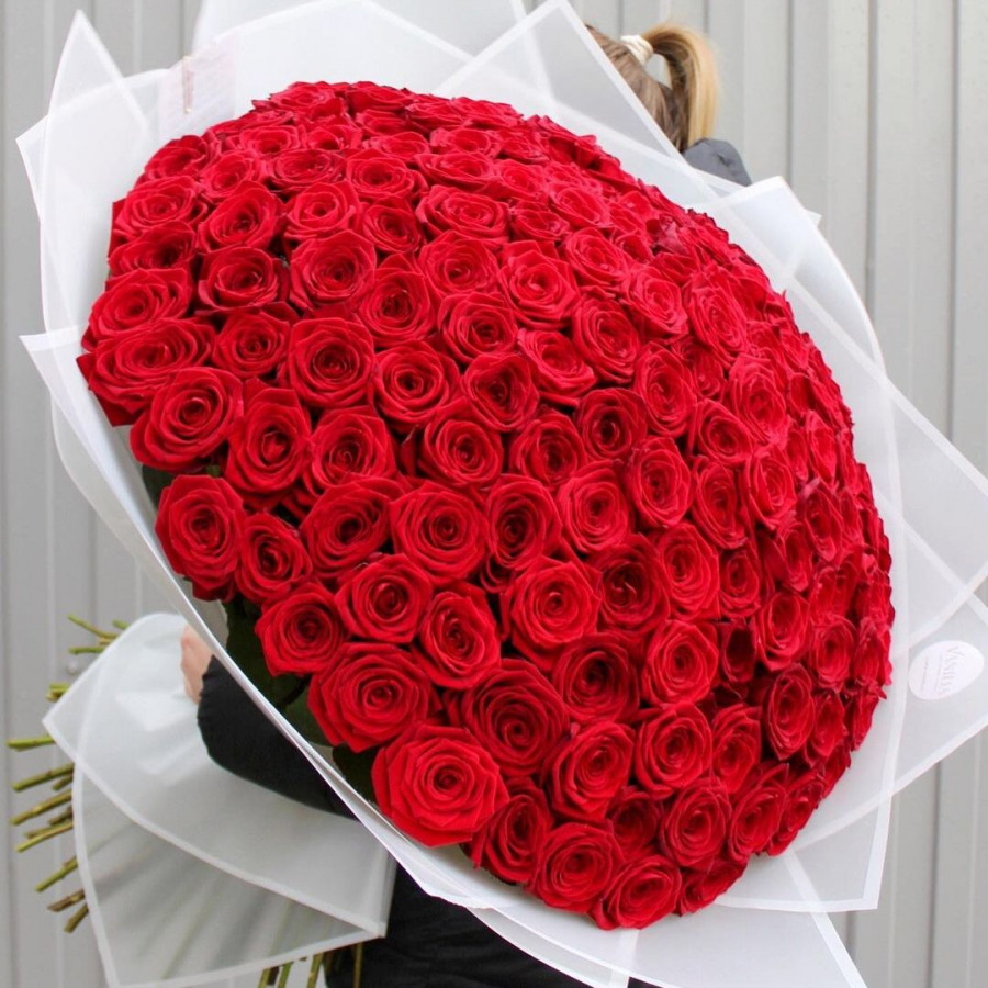 На фото букет из 151 красной розы. В составе: роза 151 шт, крафт-бумага 1 шт, атласная лента 1 шт, . Все цветы свежие и ароматные, букет красиво оформлен и отлично подходит для подарка. Доступна доставка цветов или самовывоз.