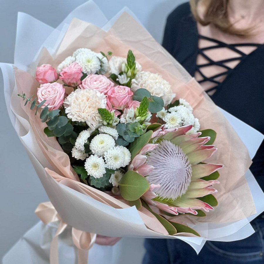На фото экзотический букет с протеей. В составе: протея 1 шт, хризантема кустовая 3 шт, кустовая роза 2 шт, эвкалипт 3 шт, гвоздика 2 шт, крафт-бумага 1 шт, атласная лента 1 шт, . Все цветы свежие и ароматные, букет красиво оформлен и отлично подходит для подарка. Доступна доставка цветов или самовывоз.