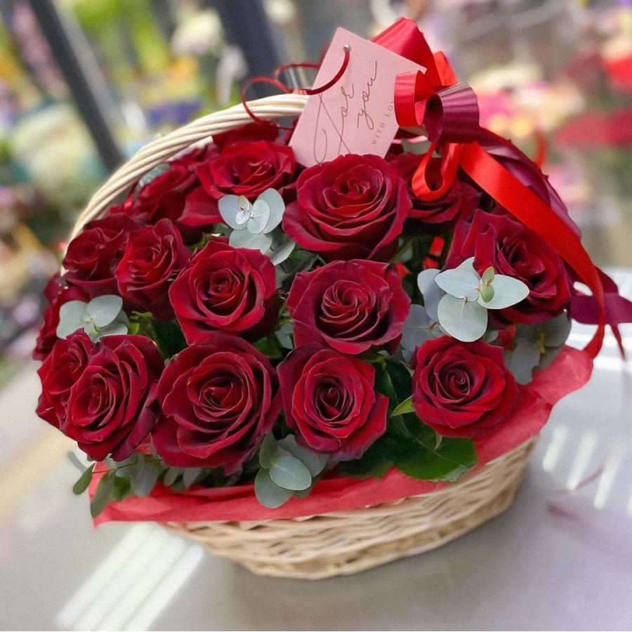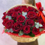 На фото композиция из 31 красной розы в плетённой корзине. В составе: роза 31 шт, эвкалипт 5 шт, корзина (l) 1 шт, атласная лента 1 шт, . Все цветы свежие и ароматные, букет красиво оформлен и отлично подходит для подарка. Доступна доставка цветов или самовывоз.